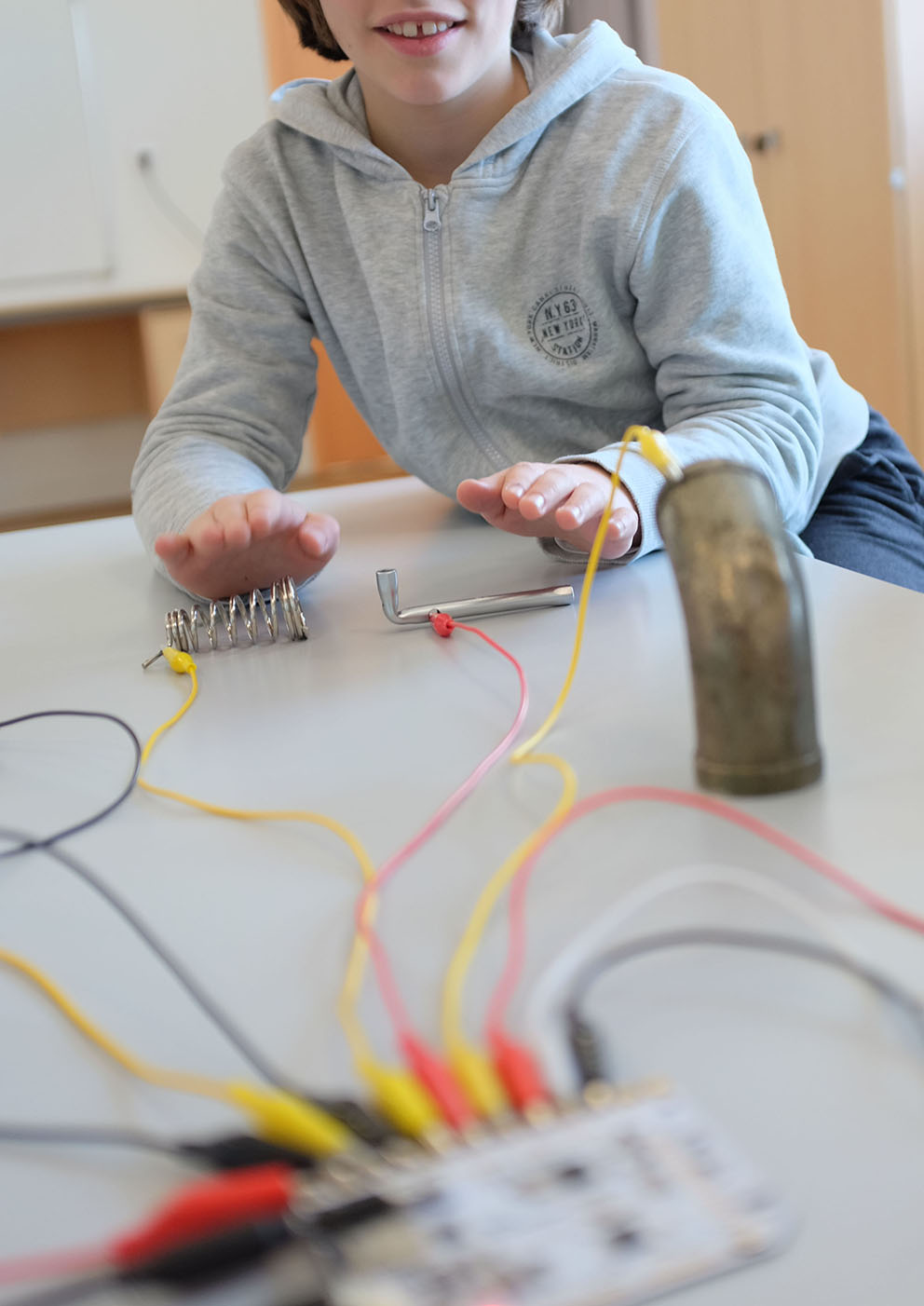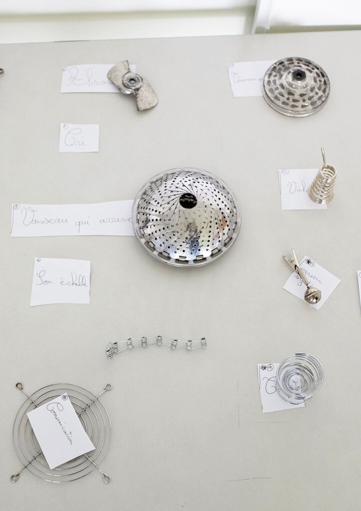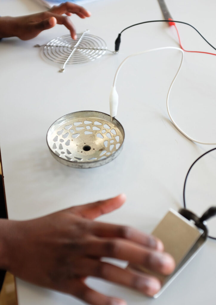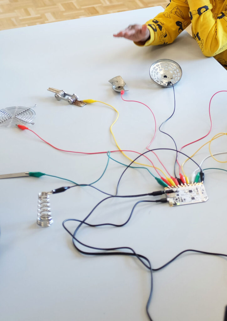 Cette proposition s’appuie sur un dispositif appelé « Touch Board », un système qui permet de lancer une séquence sonore simplement en appuyant avec son doigt sur un élément conducteur. Des ambiances musicales et sonores sont proposées aux participant.e.s. Après avoir choisi ces séquences sonores, les participant.e.s tissent petit à petit une histoire en s’inspirant des sons entendus.